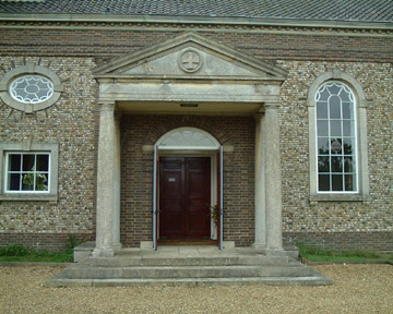 The entrance porch is flanked by Tuscan pillars and there are double doors of red mahogany |